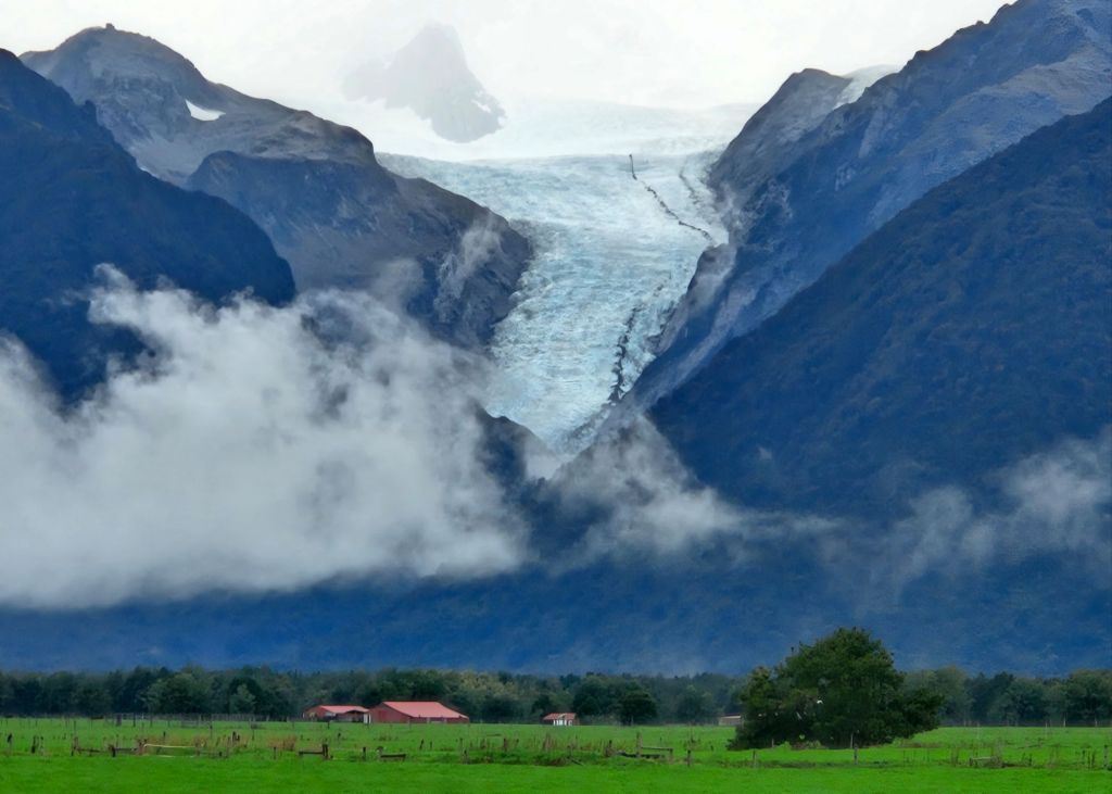 Piece de resistence was a final and very fortunate glimpse at Fox glacier and Mount cook through the clouds. The low hanging fog en route had threatened this option heavily, and to be fair to Colin, he managed our expectations well. So we were both delighted to turn the corner into the lookout spot to see the luminous blue of the ice slick, sliding down the mountain like something out of a James Bond opening scene.